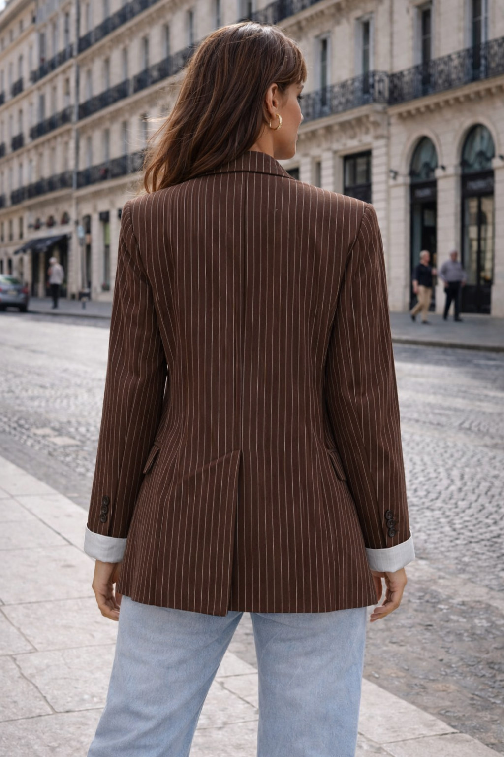 Soyez effrontément stylée & classe avec ce blazer chocolat à rayures blanches femme manches longues